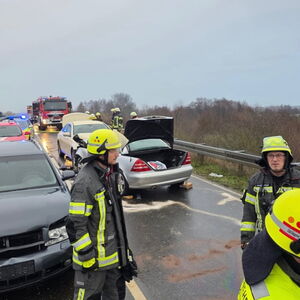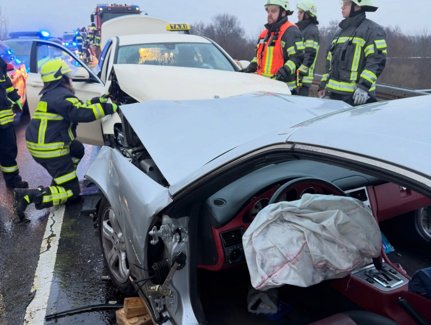 Drei Verkehrsunfälle beschäftigen die Feuerwehr am Vormittag. Der erste Verkehrsunfall wurde um 07:55 Uhr gemeldet. Hier waren zwei Fahrzeuge auf der Brücke der Ostumgehung miteinander kollidiert. Als unser Einsatzleitdienst sich nach Eintreffen an der Einsatzstelle gerade in der Erkundungsphase befand, überholte ein Taxi plötzlich das stehende Einsatzfahrzeug der Feuerwehr und die Unfallbeteiligten mit hoher Geschwindigkeit und kollidierte frontal mit einem entgegenkommenden PKW.