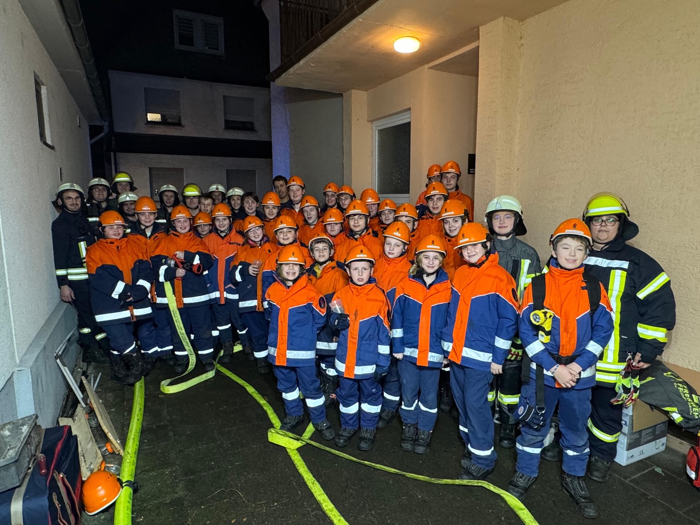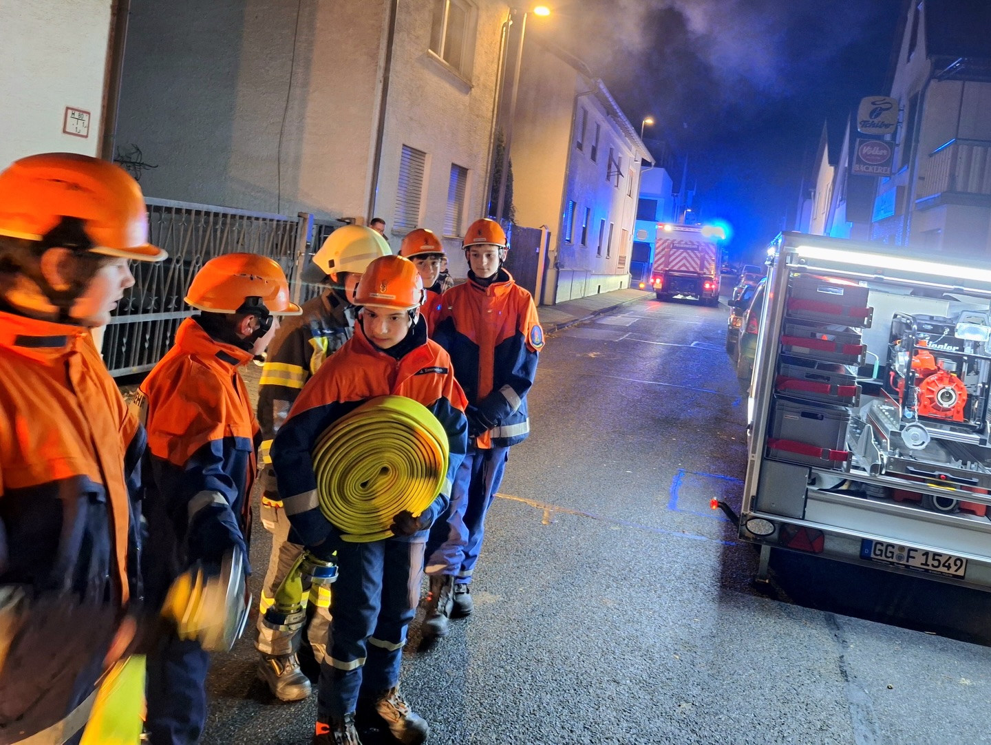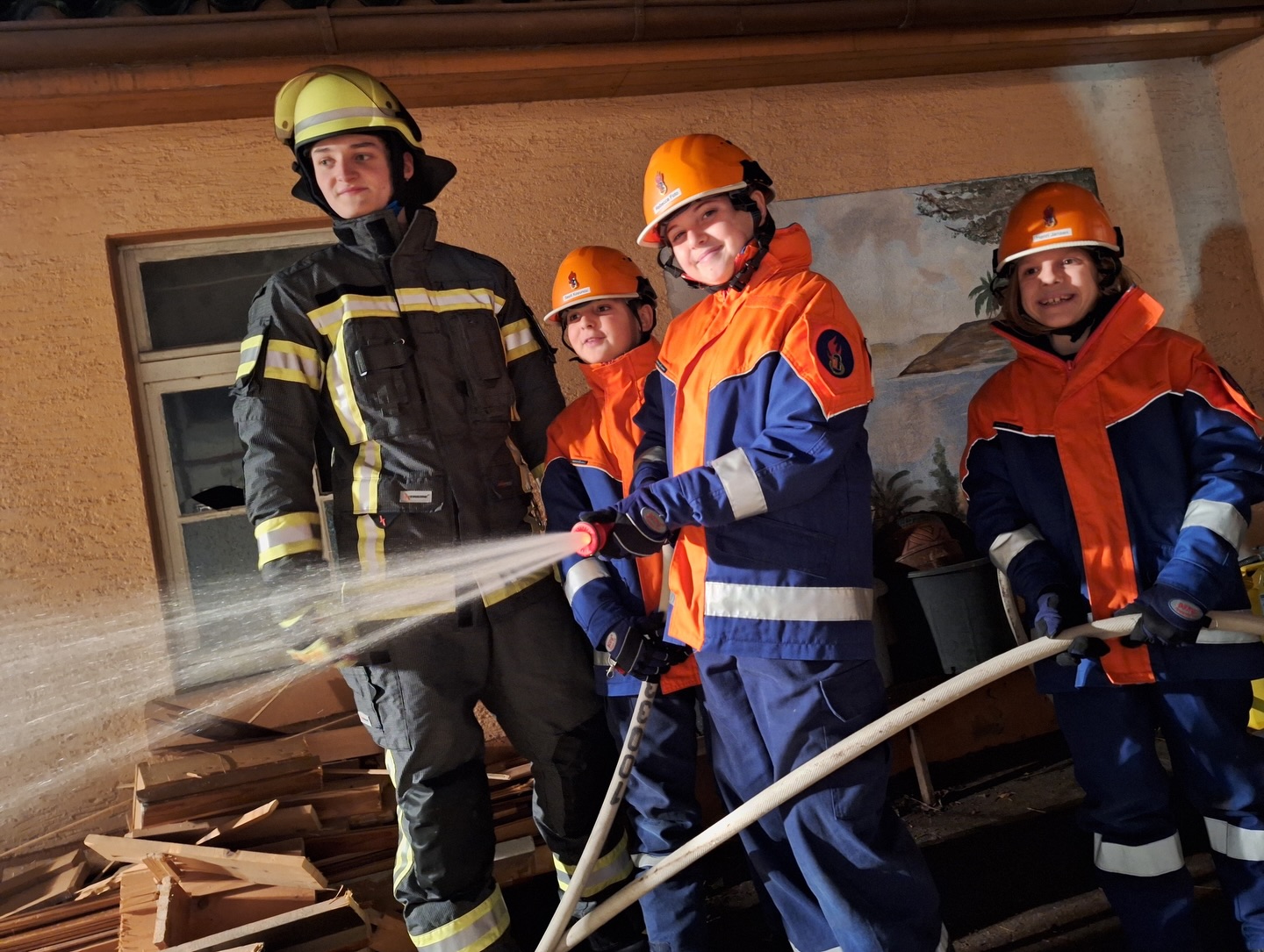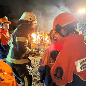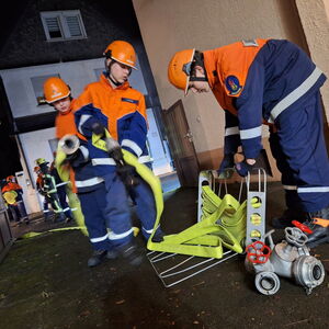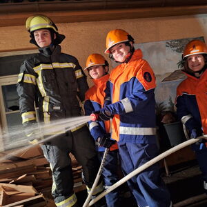 Somit erhielten die Jugendlichen unmittelbar den Auftrag mit der Personensuche und Brandbekämpfung zu beginnen. Durch die Simulation mit Übungsnebel wurden hierbei zur besseren Orientierung auch Wärmebildkameras eingesetzt. Neben dem erfolgreichen Auffinden und Retten von Personen, wurden auch einige Kuscheltiere, glücklicherweise unverletzt, in Freie gebracht. Eine weitere Übungsgruppe wurde umgehend im Außenbereich tätig, dort galt es ein außer Kontrolle geratenes Grillfeuer abzulöschen. Zudem konnten die Nachwuchskräfte die Einsatzstelle mit mehreren Scheinwerfern sicher ausleuchten.