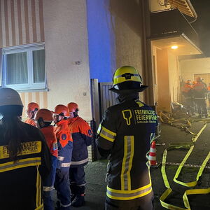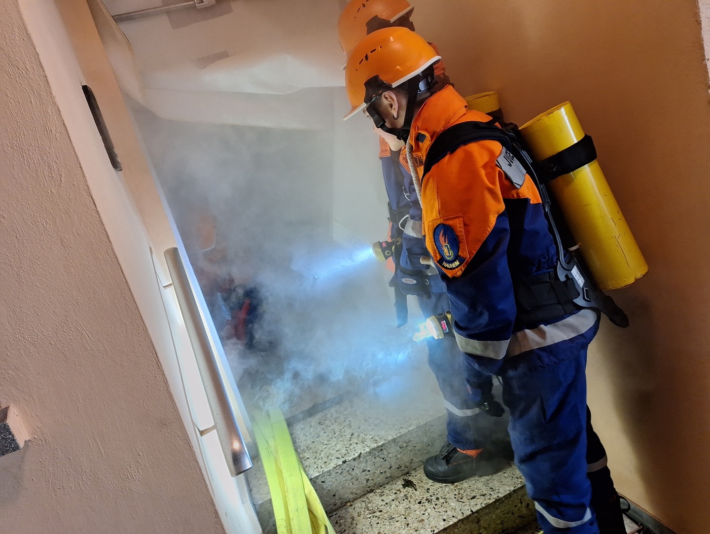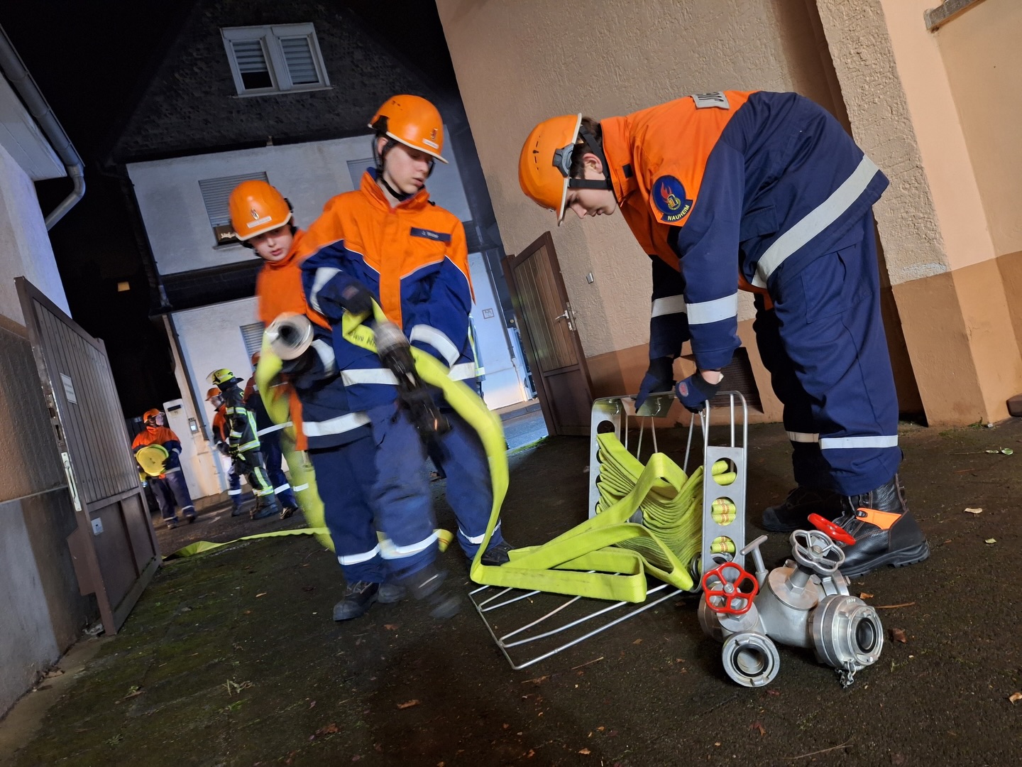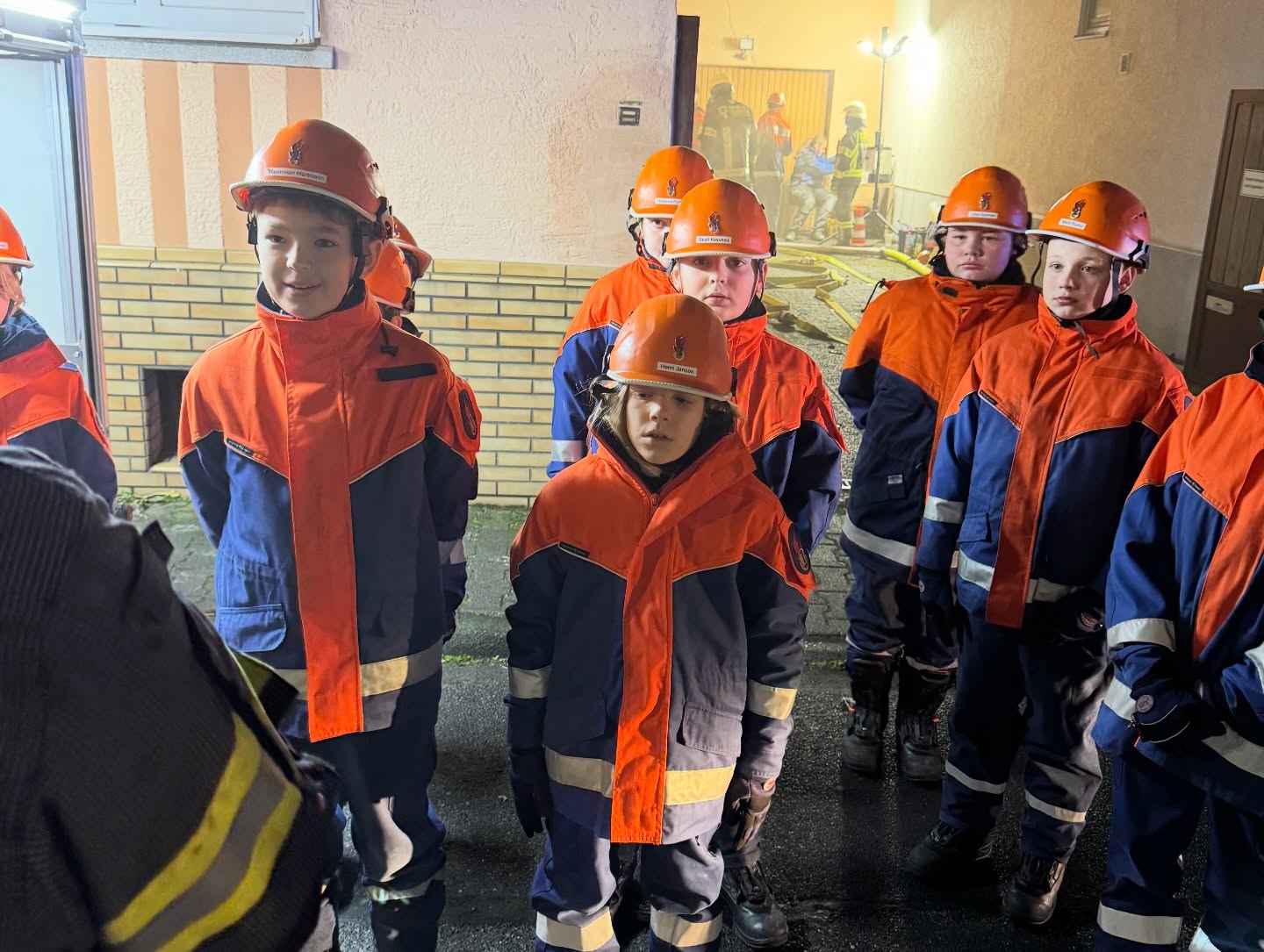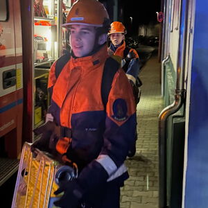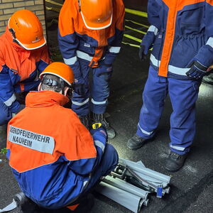 Somit erhielten die Jugendlichen unmittelbar den Auftrag mit der Personensuche und Brandbekämpfung zu beginnen. Durch die Simulation mit Übungsnebel wurden hierbei zur besseren Orientierung auch Wärmebildkameras eingesetzt. Neben dem erfolgreichen Auffinden und Retten von Personen, wurden auch einige Kuscheltiere, glücklicherweise unverletzt, in Freie gebracht. Eine weitere Übungsgruppe wurde umgehend im Außenbereich tätig, dort galt es ein außer Kontrolle geratenes Grillfeuer abzulöschen. Zudem konnten die Nachwuchskräfte die Einsatzstelle mit mehreren Scheinwerfern sicher ausleuchten.