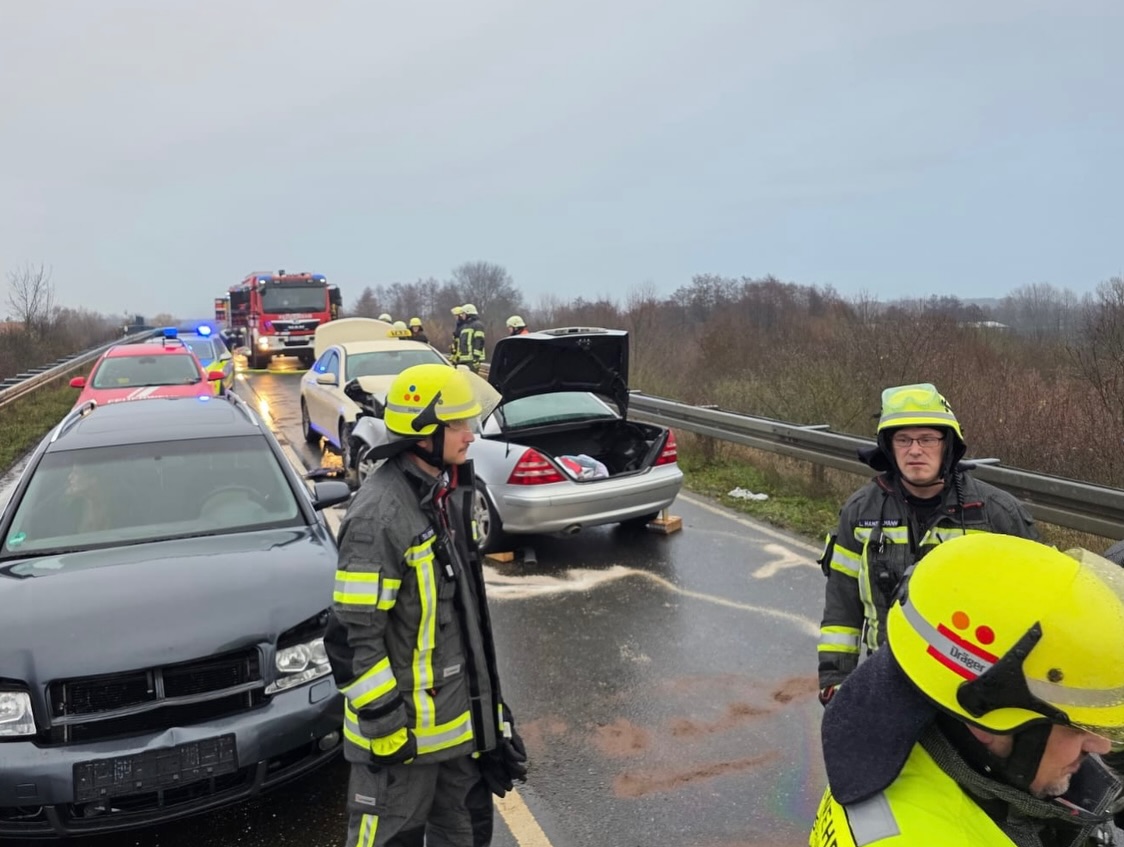 Drei Verkehrsunfälle beschäftigen die Feuerwehr am Vormittag. Der erste Verkehrsunfall wurde um 07:55 Uhr gemeldet. Hier waren zwei Fahrzeuge auf der Brücke der Ostumgehung miteinander kollidiert. Als unser Einsatzleitdienst sich nach Eintreffen an der Einsatzstelle gerade in der Erkundungsphase befand, überholte ein Taxi plötzlich das stehende Einsatzfahrzeug der Feuerwehr und die Unfallbeteiligten mit hoher Geschwindigkeit und kollidierte frontal mit einem entgegenkommenden PKW.