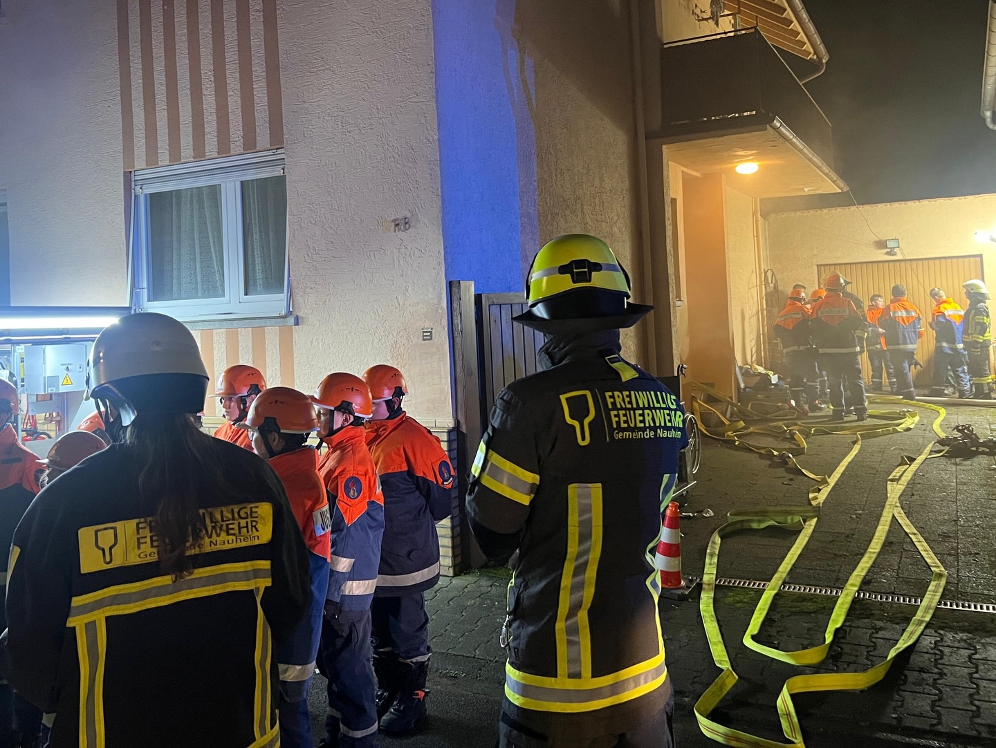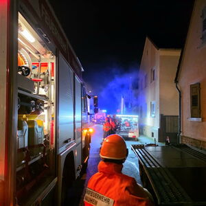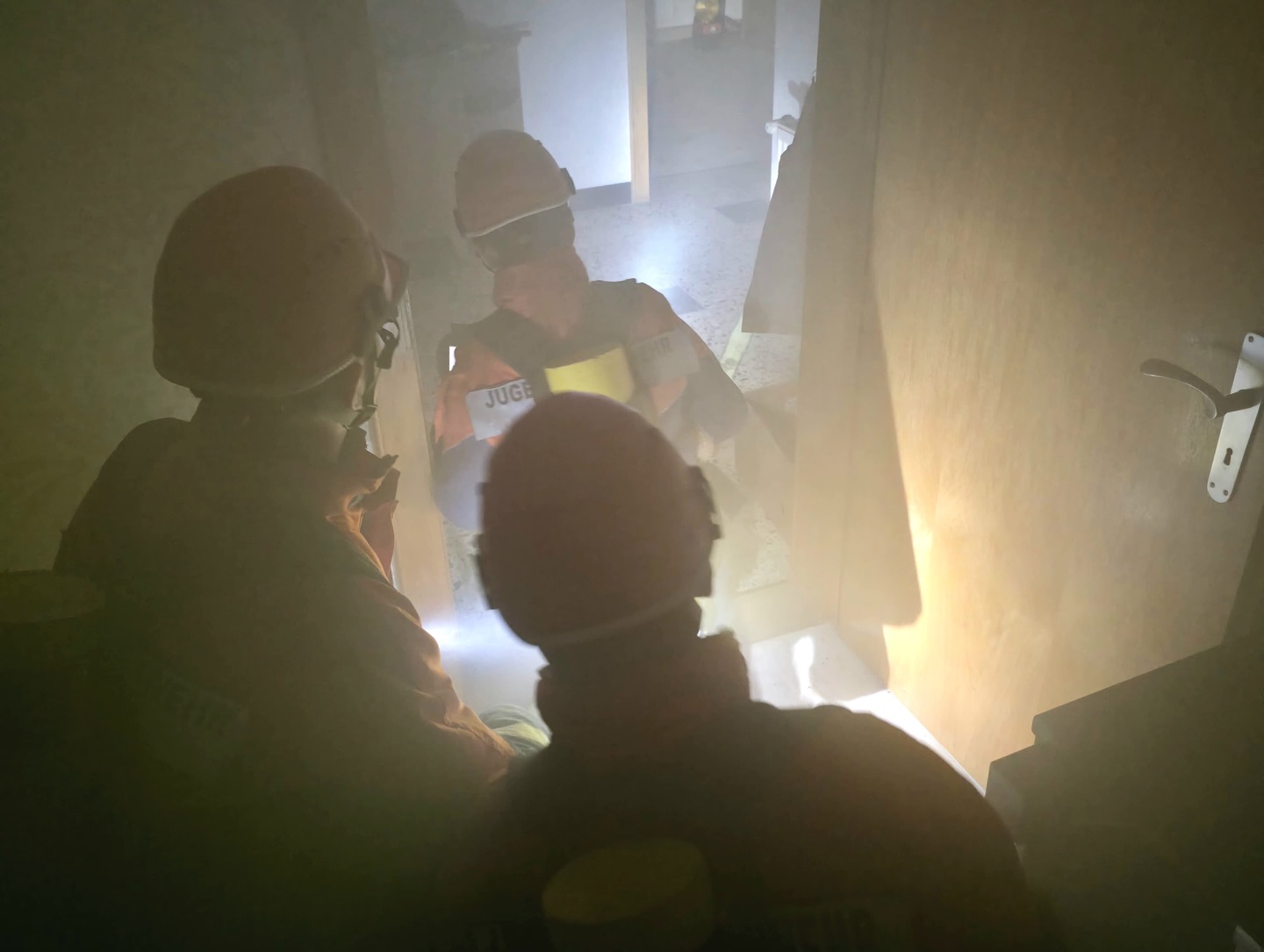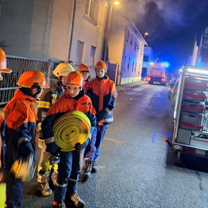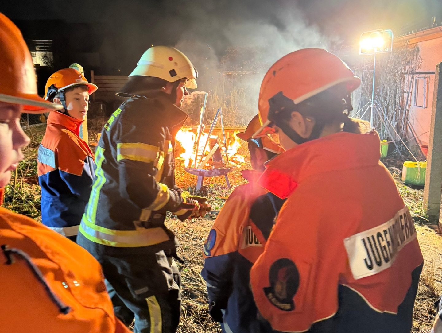 Somit erhielten die Jugendlichen unmittelbar den Auftrag mit der Personensuche und Brandbekämpfung zu beginnen. Durch die Simulation mit Übungsnebel wurden hierbei zur besseren Orientierung auch Wärmebildkameras eingesetzt. Neben dem erfolgreichen Auffinden und Retten von Personen, wurden auch einige Kuscheltiere, glücklicherweise unverletzt, in Freie gebracht. Eine weitere Übungsgruppe wurde umgehend im Außenbereich tätig, dort galt es ein außer Kontrolle geratenes Grillfeuer abzulöschen. Zudem konnten die Nachwuchskräfte die Einsatzstelle mit mehreren Scheinwerfern sicher ausleuchten.